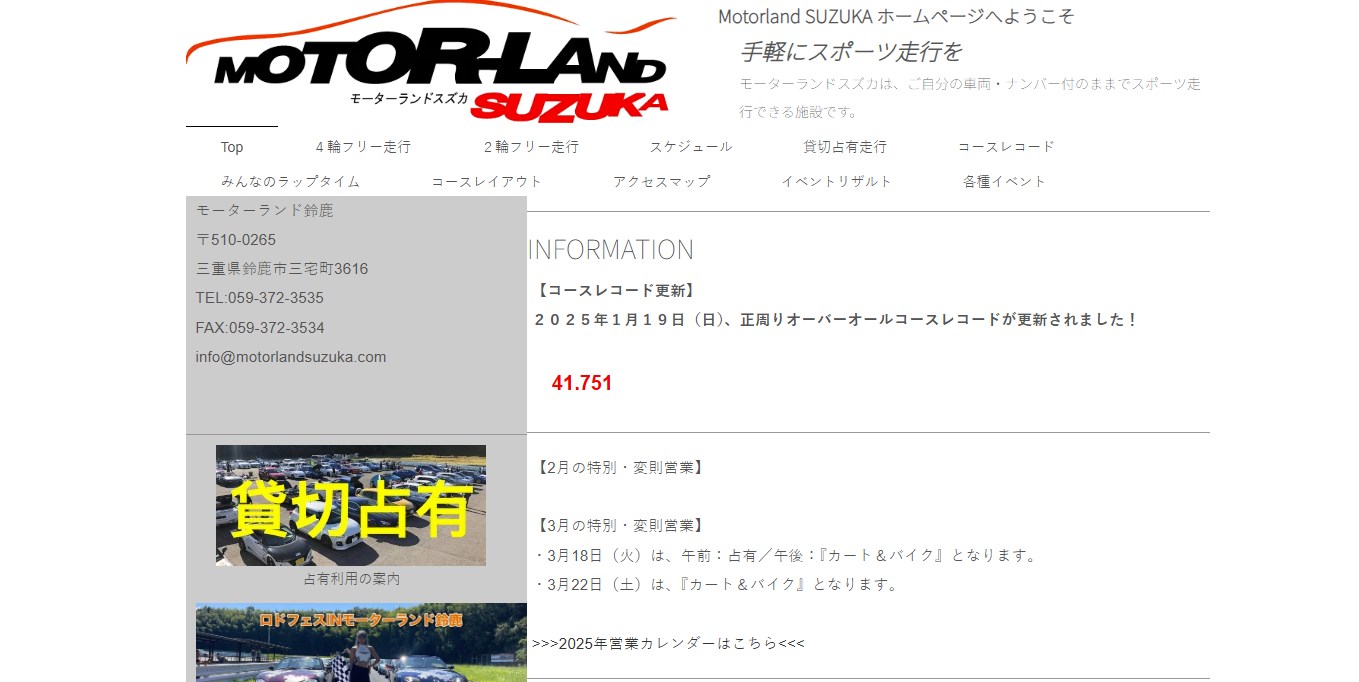 走行会情報 主に貸切イベントが中心ですが、不定期に走行会やレースも開催されています。サーキット初心者や友人同士での利用に適しています。