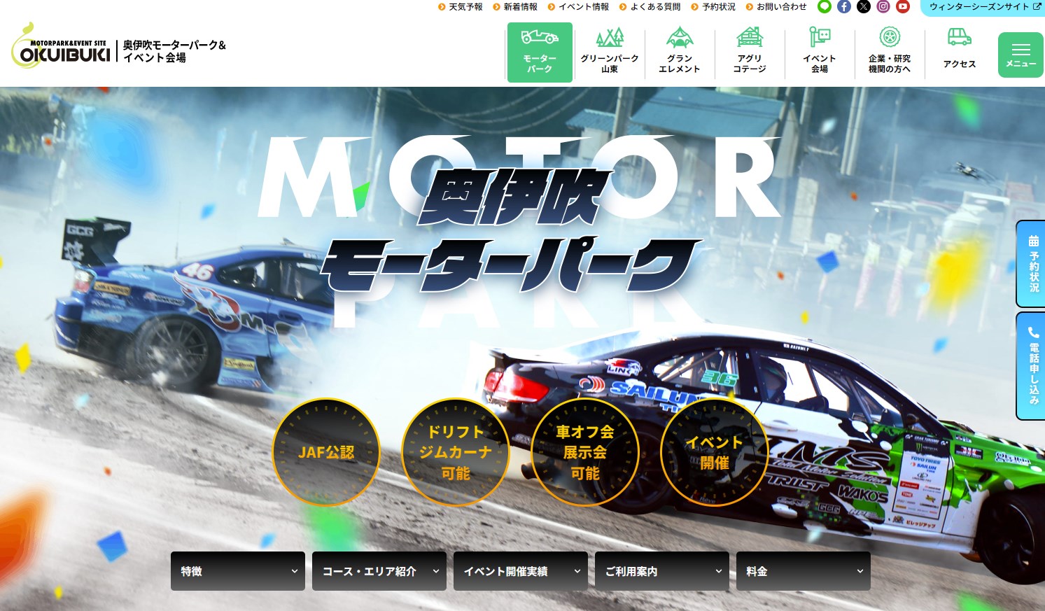 奥伊吹モーターパークは、ドリフト走行・ジムカーナ走行が可能なドライビングスポット!JAF公認大会も開催!走行会、オフ会、展示会、イベントなどご自由にご利用ください。
