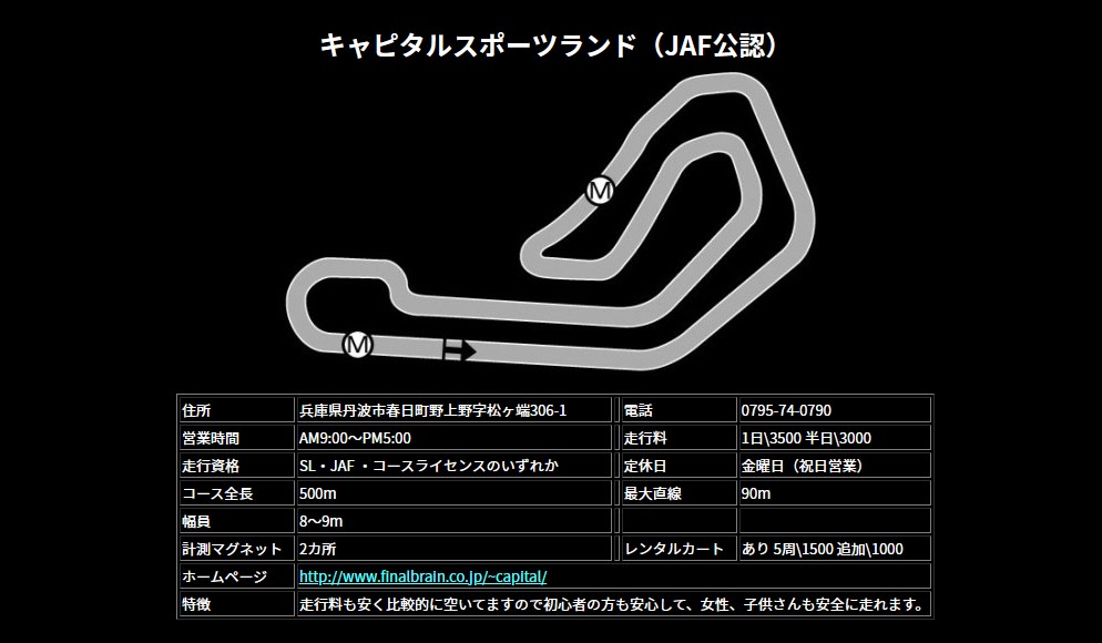私自身がメインで走行してるサーキット。大阪市内からのアクセスがいい鈴鹿(亀山)エリアにある。グリップとドリフトでコース(全長1.75km)を分割して走行できる日やフルコースでの走行日がありミニサーキットながらもフルコースでは長い直線でのブレーキングが楽しめます。