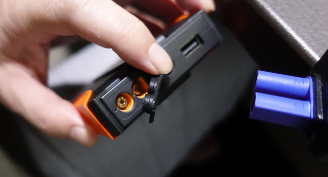 本体のメガネ端子にブースターケーブルのアダプターを装着