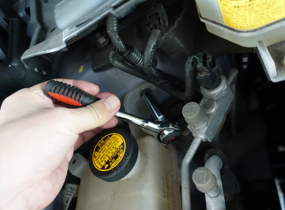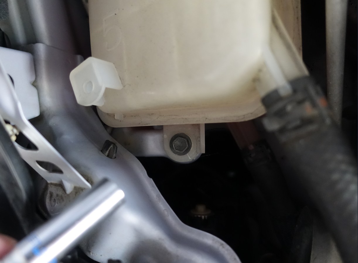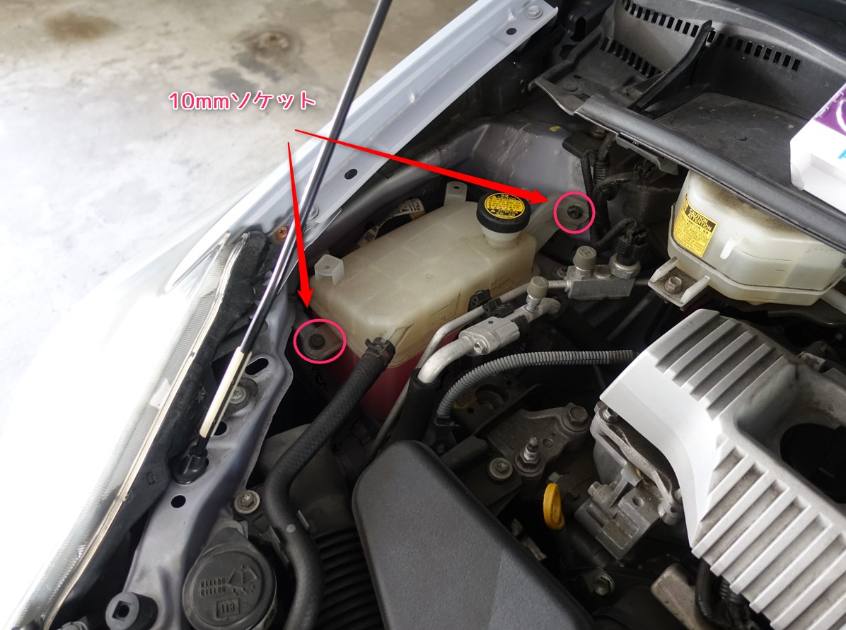 運転席側はウォッシャータンクが邪魔になるので、ボルト2本はずしてウォッシャータンクを移動させます